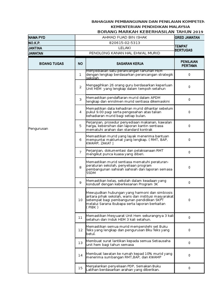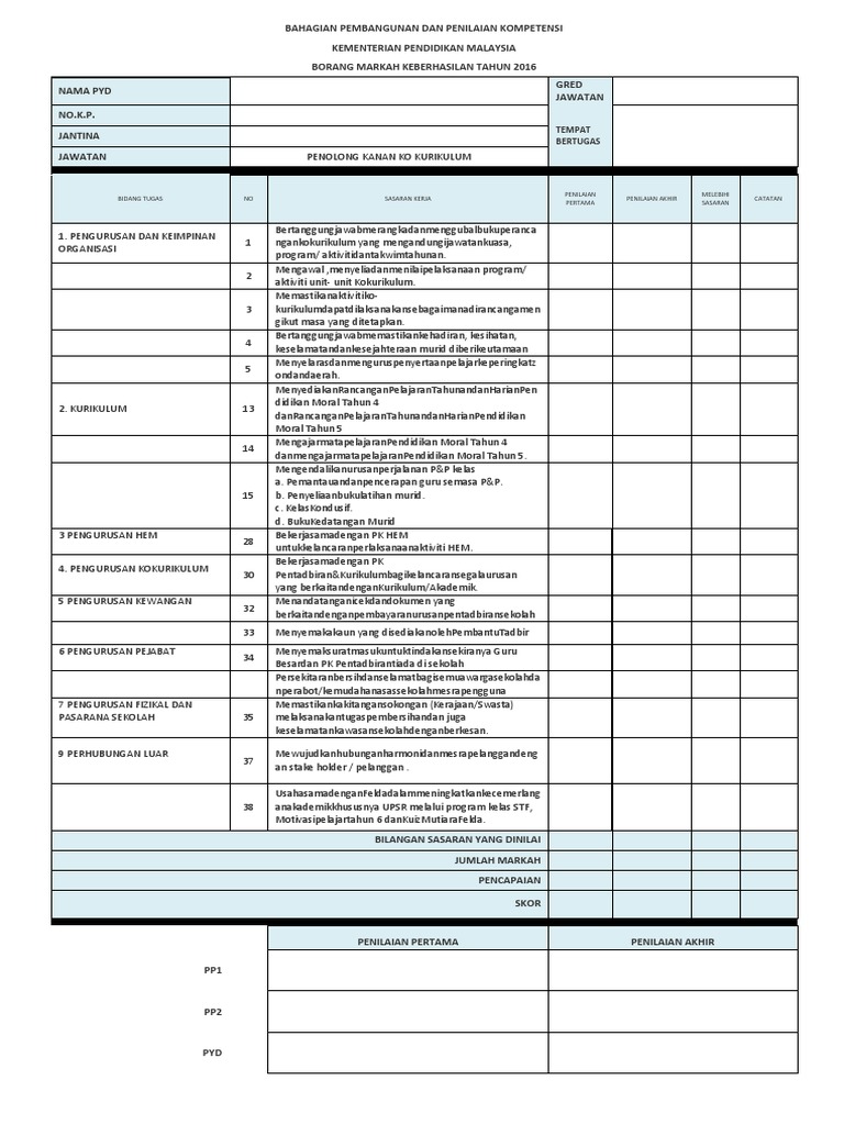 INSTRUMEN KEBERHASILAN PENOLONG KANAN BAHAGIAN PEMBANGUNAN DNA PENILAIAN KOMPETENSI KEMENTERIAN PENDIDIKAN MALAYSIA BIL PERKARA KT S KS Skor 10 GPK PENTADBIRAN KURIKULUM 11 Penilaian Dalaman1 12 Peperiksaan 1 13 Murid gagal satu mata pelajaran2 20 GPK HAL EHWAL MURID 21 Disiplin Murid 2 SSDM 22 Kehadiran. Ketiga-tiga elemen berikut perlu dipertimbangkan secara profesional semasa membuat penilaian sasaran keberhasilan yang telah ditetapkan iaitu. Muat turun Borang Markah Keberhasilan 2016 1 Borang Markah Keberhasilan 2016 Pengiraan Klik di sini 2 Borang Markah Keberhasilan.